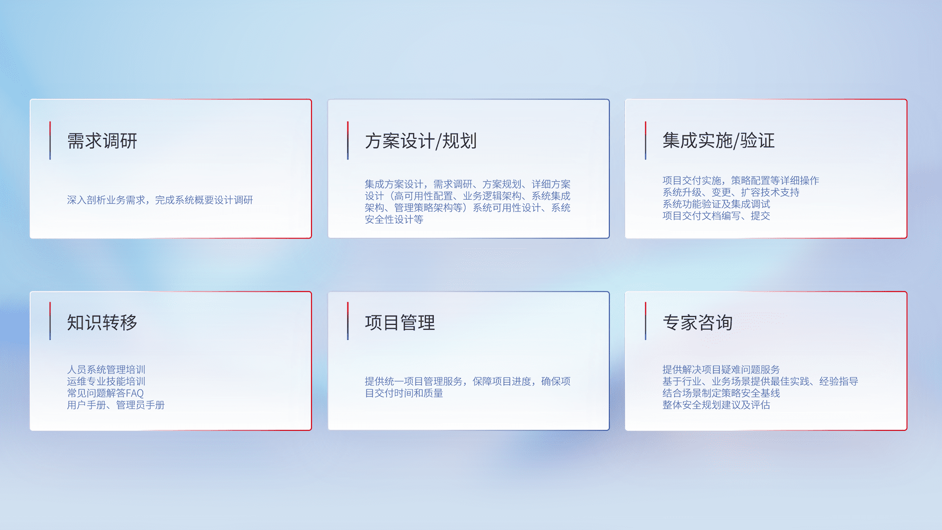 针对客户行业特性,,将宏观的安全战略和需求,,,,通过专业的交付服务,,实现项目落地,,为客户提供标准规范的集成交付服务。。